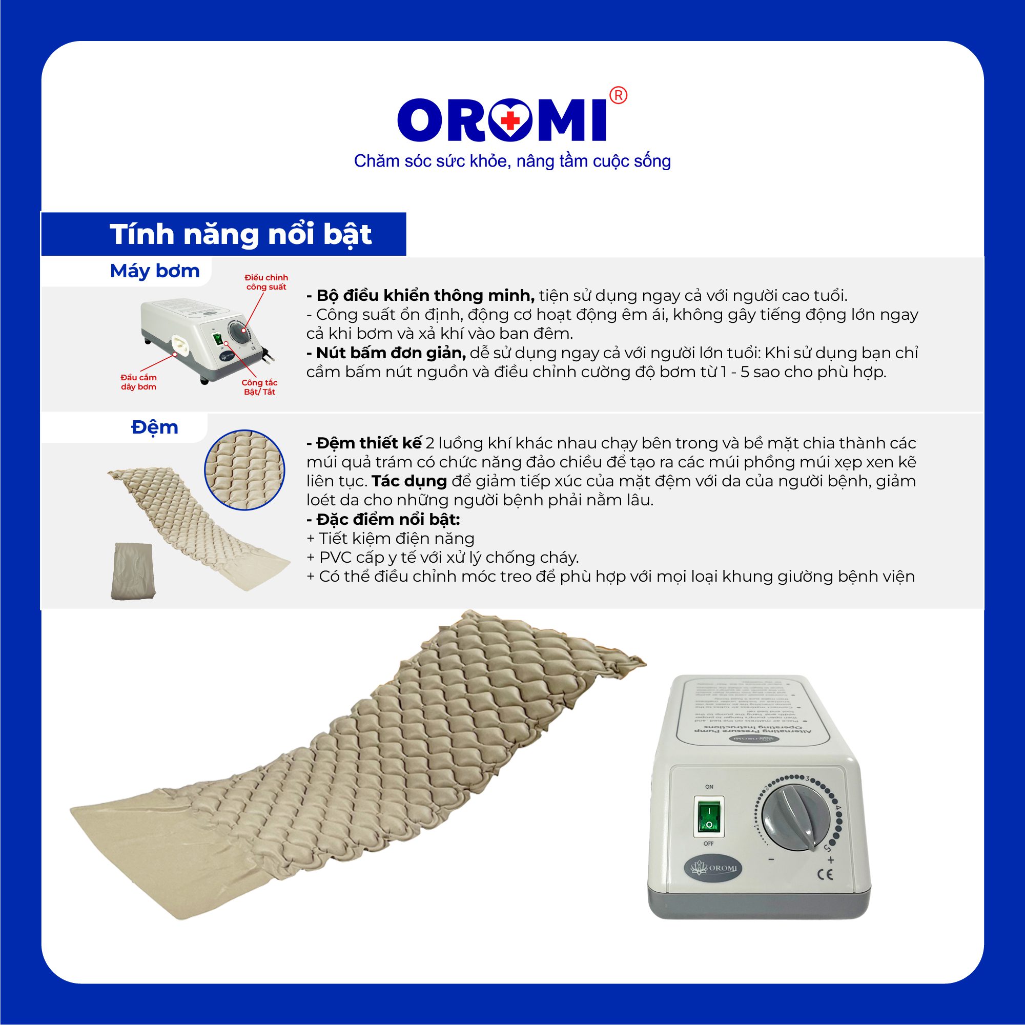 Lắp đặt: Trải nệm lên giường, cố định bằng dây đai. Treo máy bơm ở cuối giường bằng móc.