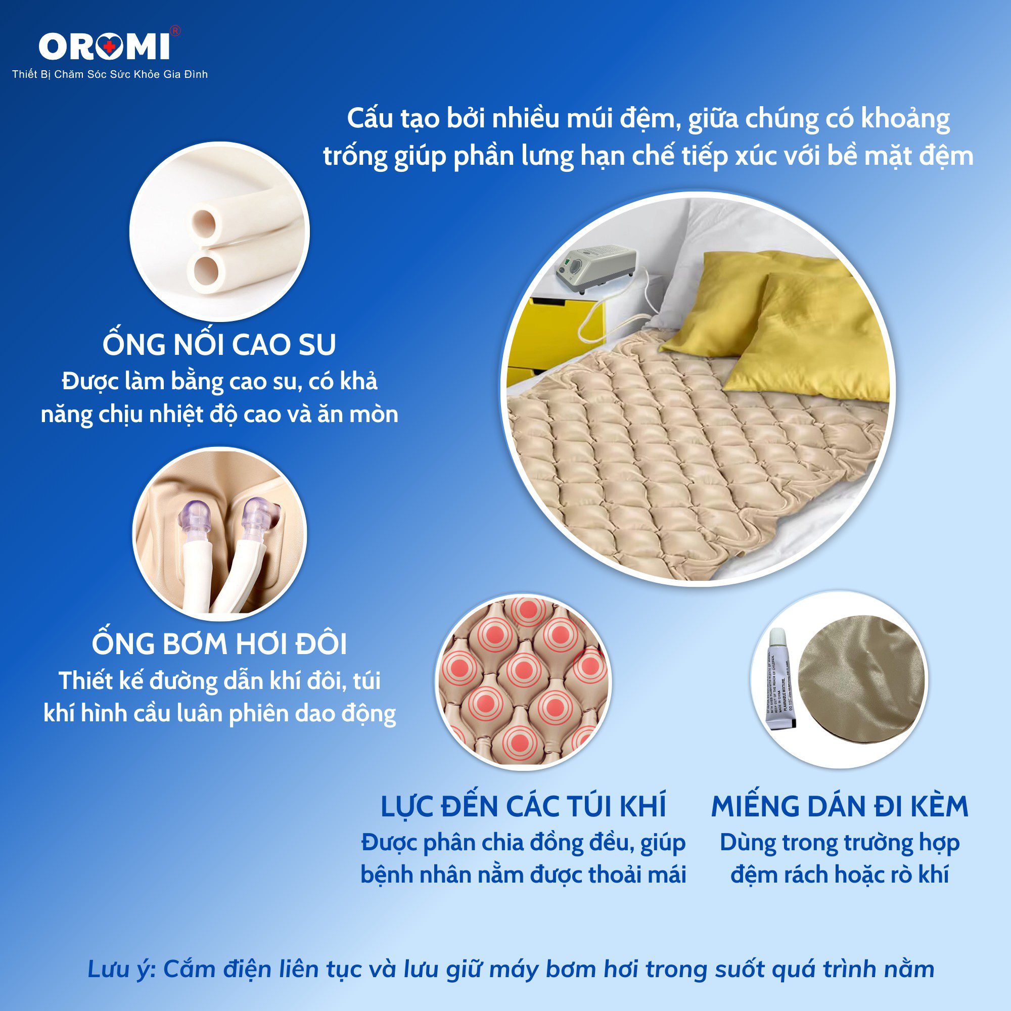Hoạt động liên tục: Đây là sản phẩm cần cắm điện liên tục trong suốt quá trình nằm để duy trì cơ chế luân chuyển chống loét.