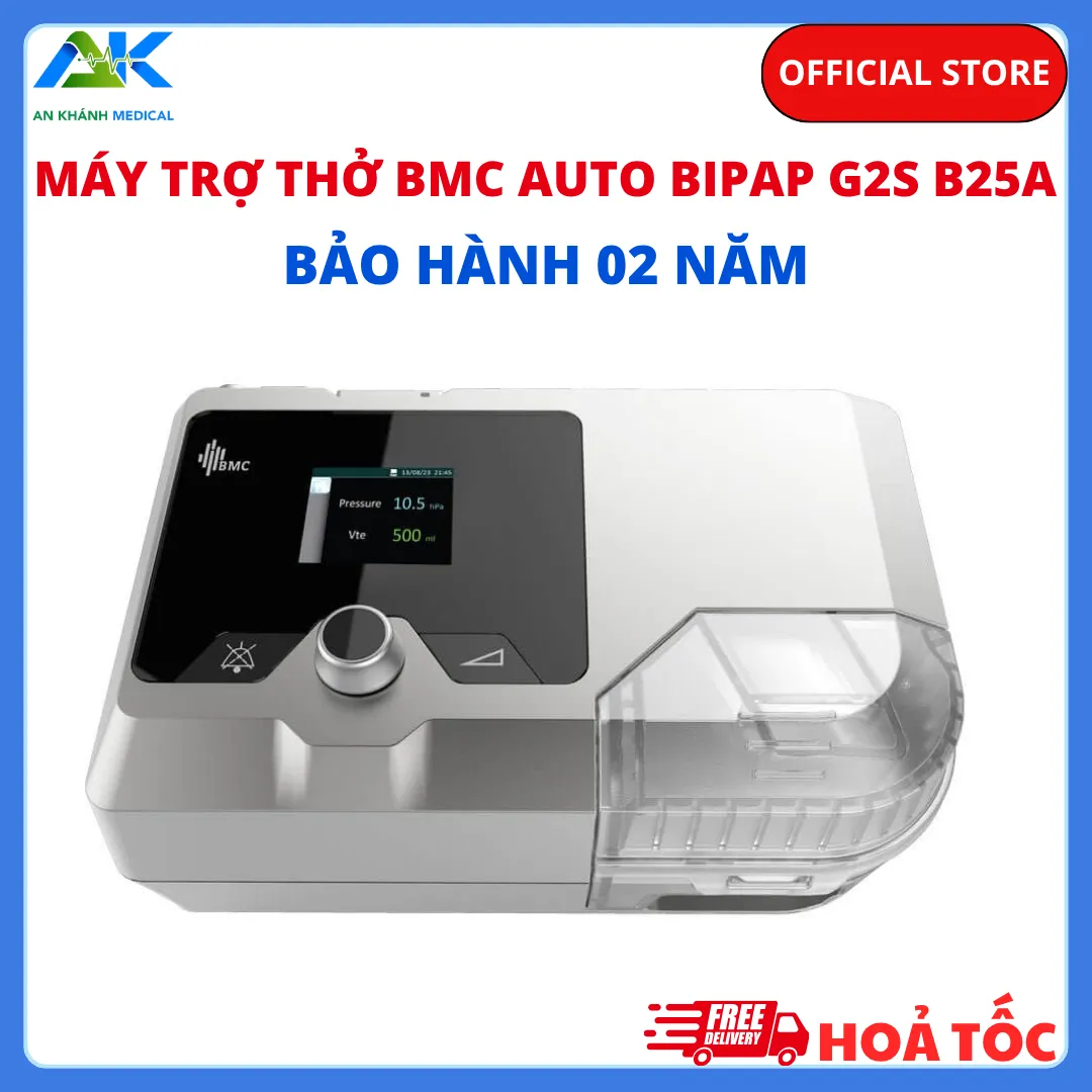 Máy trợ thở BMC Auto BIPAP G2S B25A là thiết bị Auto BiPAP (thông khí hai mức áp lực dương tự động) không xâm lấn, dùng điều trị chứng ngưng thở khi ngủ (OSA), ngưng thở trung ương (CSA) hoặc suy hô hấp nhẹ. Máy giúp tối ưu hóa áp lực hít vào (IPAP) và thở ra (EPAP), mang lại sự thoải mái, bù rò rỉ và theo dõi dữ liệu điều trị, đặc biệt phù hợp cho bệnh nhân COPD.